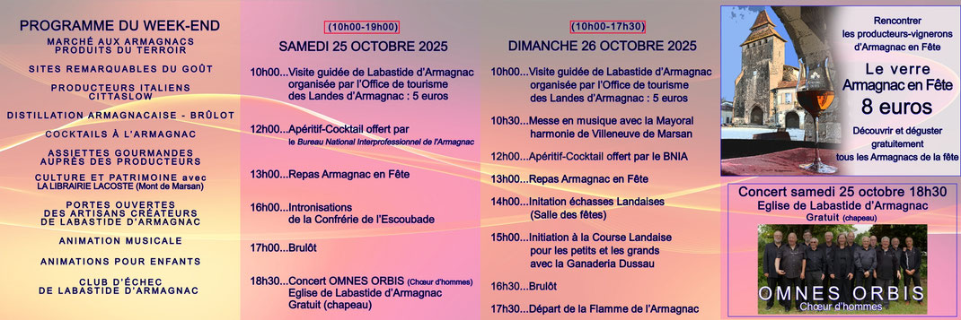 De nombreuses animations : alambic en fonctionnement, cocktails, démonstration d'échasses, brûlot, intronisations, initiation à la course landaise, visite guidée de Labastide d'Armagnac, musique, concert, ...